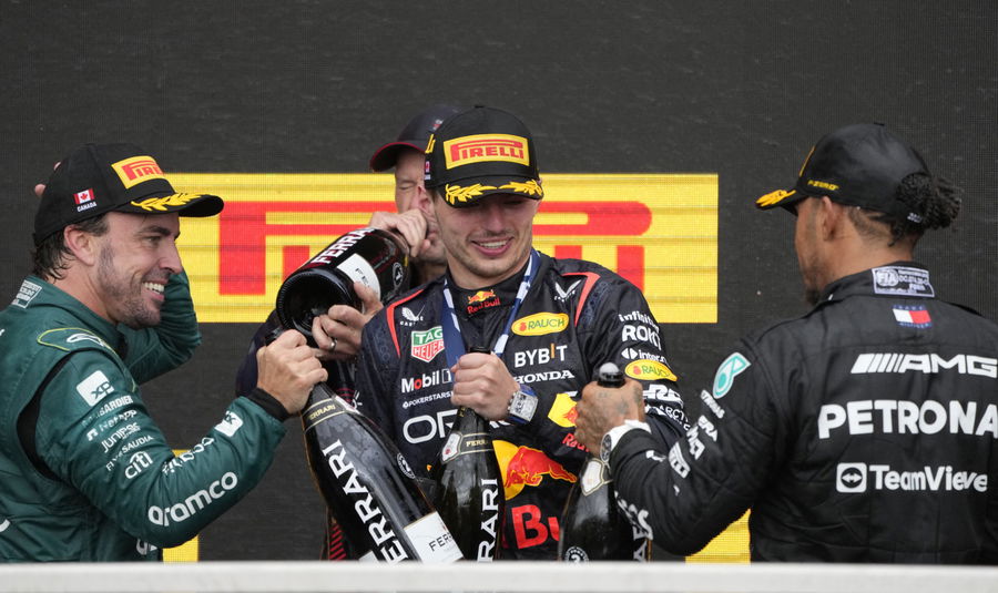 Formula One F1 – Canadian Grand Prix – Circuit Gilles Villeneuve, Montreal, Canada – June 18, 2023. Race winner Red Bull’s Max Verstappen, second placed. Aston Martin’s Fernando Alonso and third-placed. Mercedes’ Lewis Hamilton celebrate with sparkling wine on the podium. Red Bull chief technology officer Adrian Newey drinks from a bottle. REUTERS/Mathieu Belanger