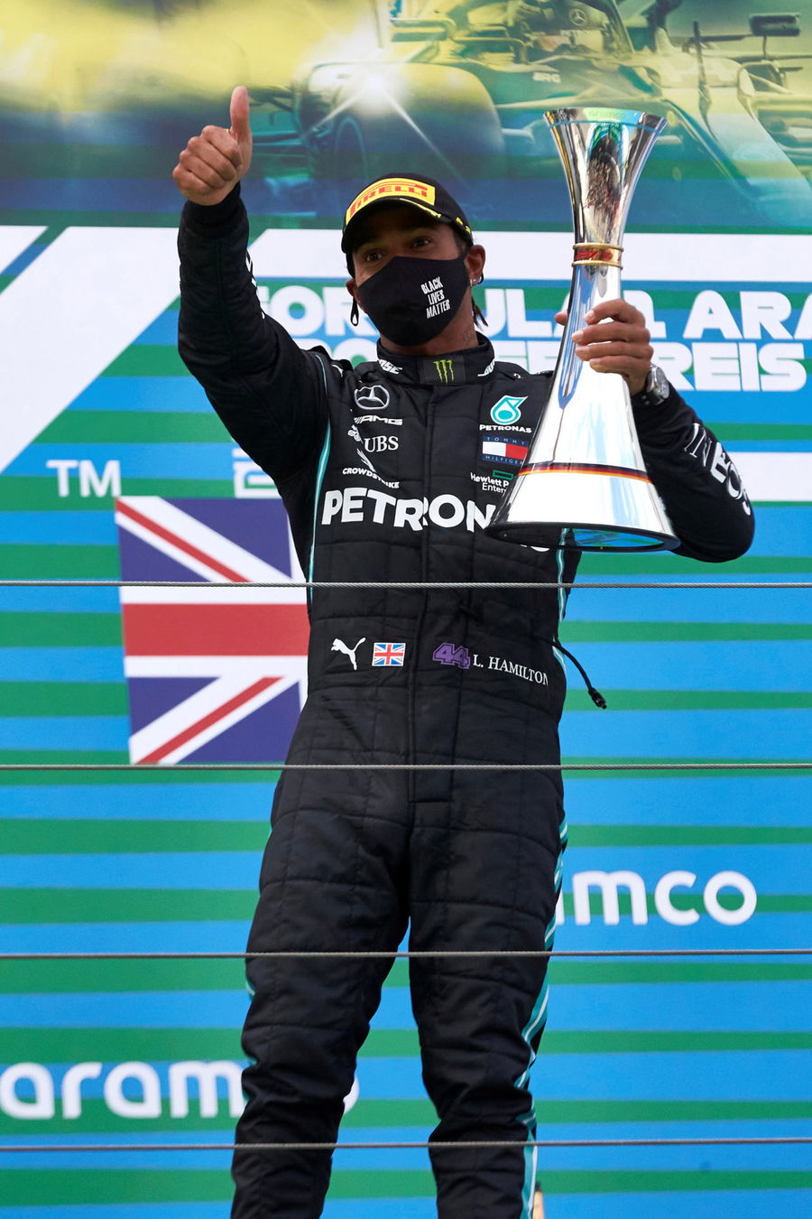 Formula One F1 – Eifel Grand Prix – Nurburgring, Nurburg, Germany – Mercedes’ Lewis Hamilton celebrates with a trophy on the podium after winning the race FIA/Handout via REUTERS