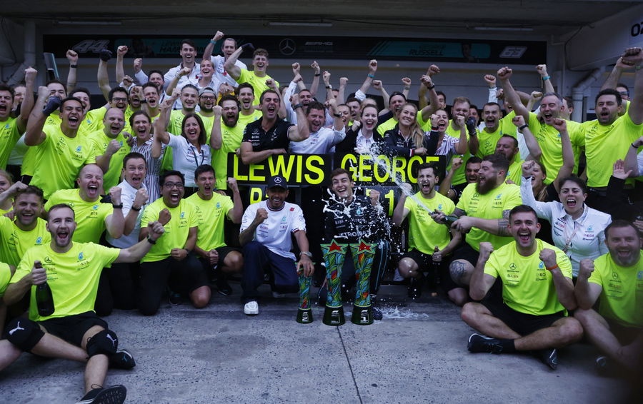Formula One F1 – Brazilian Grand Prix – Jose Carlos Pace Circuit, Sao Paulo, Brazil – November 13, 2022 Mercedes’ George Russell celebrates after winning the race alongside Mercedes’ Lewis Hamilton and teammates REUTERS/Amanda Perobelli