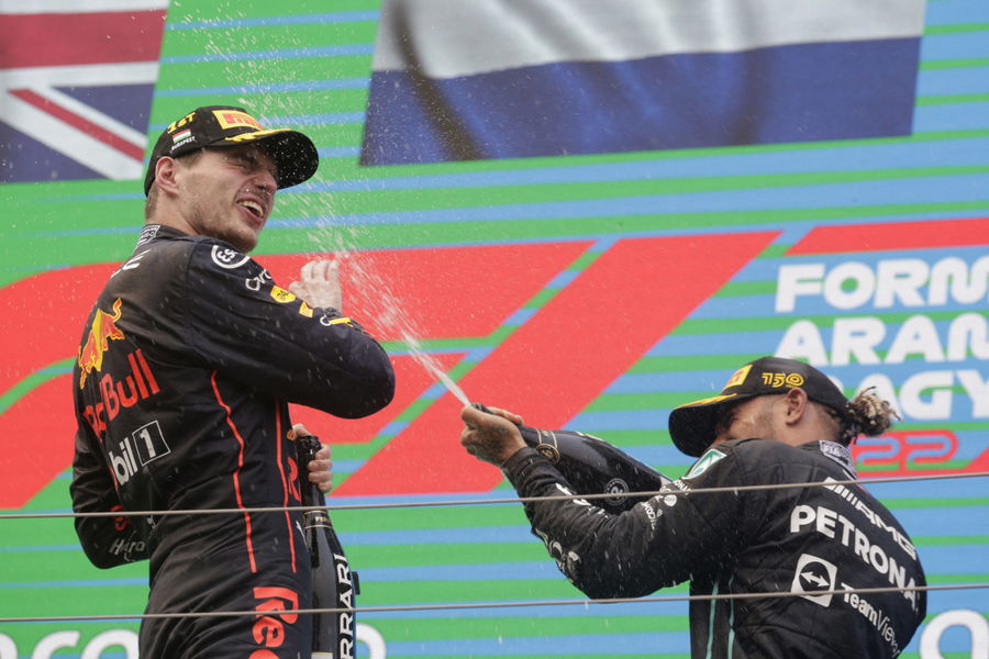 Formula One F1 – Hungarian Grand Prix – Hungaroring, Budapest, Hungary – July 31, 2022 Red Bull’s Max Verstappen celebrates on the podium with sparkling wine after winning the race with second placed Mercedes’ Lewis Hamilton REUTERS/Lisa Leutner