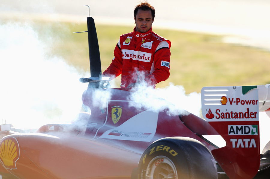 VALENCIA, SPAIN – FEBRUARY 03: Felipe Massa of Brazil and Ferrari looks at his car following an engine problem during day three of winter testing at the Ricardo Tormo Circuit on February 3, 2011 in Valencia, Spain. (Photo by Mark Thompson/Getty Images)