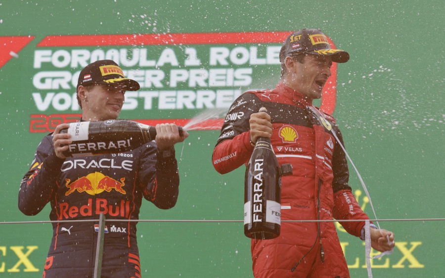 Formula One F1 – Austrian Grand Prix – Red Bull Ring, Spielberg, Austria – July 10, 2022, Ferrari’s Charles Leclerc celebrates on the podium after winning the Austrian Grand Prix as Red Bull’s Max Verstappen celebrates after placing second REUTERS/Leonhard Foeger