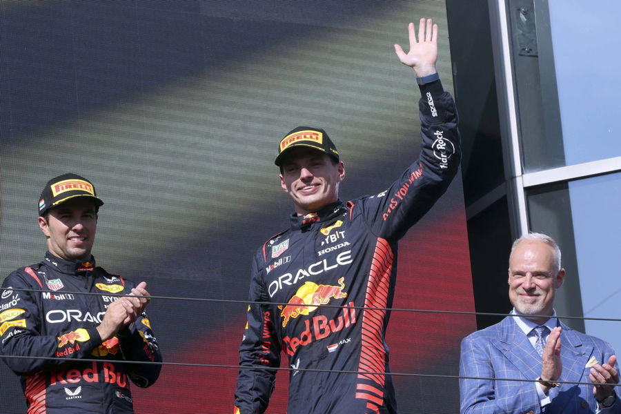 VERSTAPPEN Max F1 Team Red Bull Racing at the award ceremony with. PEREZ Sergio F1 GP of Hungary 2023 on 23 07 2023 in. Budapest Copyright: xJerryxAndrex