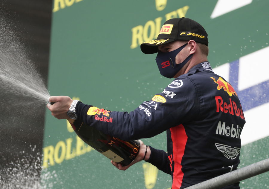 Formula One F1 – Belgian Grand Prix – Spa-Francorchamps, Spa, Belgium – August 30, 2020, Red Bull’s Max Verstappen celebrates with champagne on the podium after finishing third in the race | Courtesy: Pool via REUTERS/Stephanie Lecocq