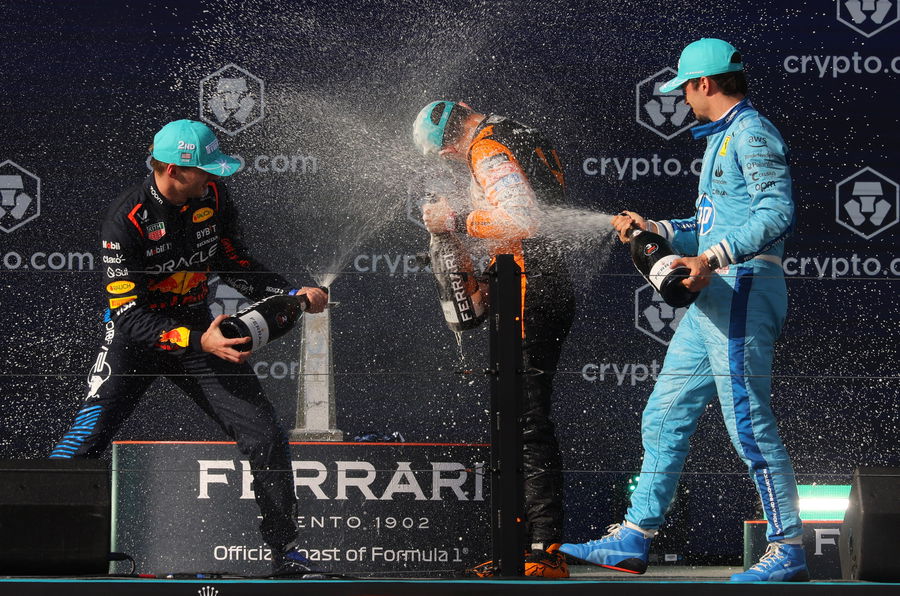 Formula One F1 – Miami Grand Prix – Miami International Autodrome, Miami, Florida, United States – May 5, 2024 McLaren’s Lando Norris celebrates winning the Miami Grand Prix on the podium with the trophy alongside second placed Red Bull’s Max Verstappen and third placed Ferrari’s Charles Leclerc REUTERS/Brian Snyder