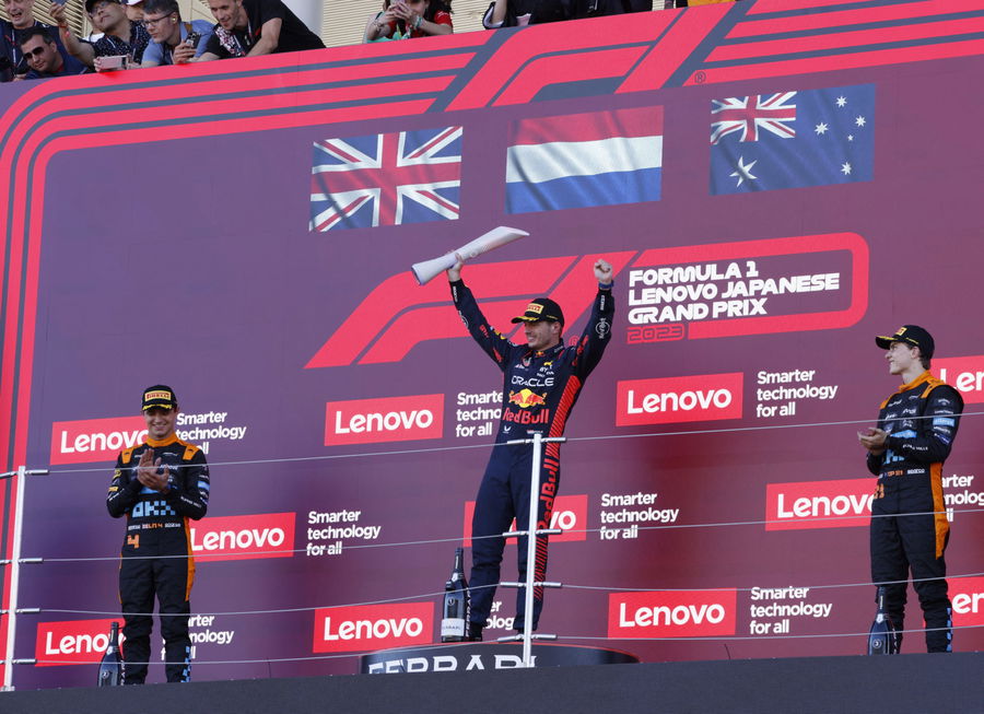 Formula One F1 – Japanese Grand Prix – Suzuka Circuit, Suzuka, Japan – September 24, 2023 Red Bull’s Max Verstappen celebrates on the podium with a trophy after winning the Japanese Grand Prix alongside second placed McLaren’s Lando Norris and third placed McLaren’s Oscar Piastri REUTERS/Androniki Christodoulou