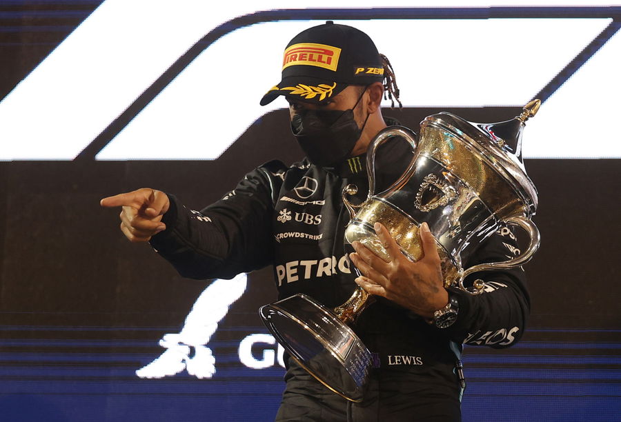 Formula One F1 – Bahrain Grand Prix – Bahrain International Circuit, Sakhir, Bahrain – Mercedes’ Lewis Hamilton celebrates winning the race on the podium with the trophy Pool via REUTERS/Lars Baron