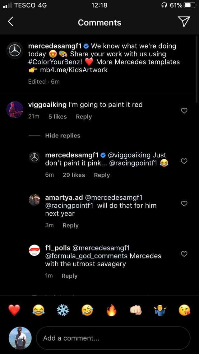 We have seen the light banter of teams on social media sites already in the past. The Mercedes F1 team also seems to like that. Above all, a fan said that he will paint it red and the response from the team was cheeky. Mercedes F1 took a sly dig at the Racing Point F1 team and said: “Just don’t paint it pink… @racingpointf1😂“.