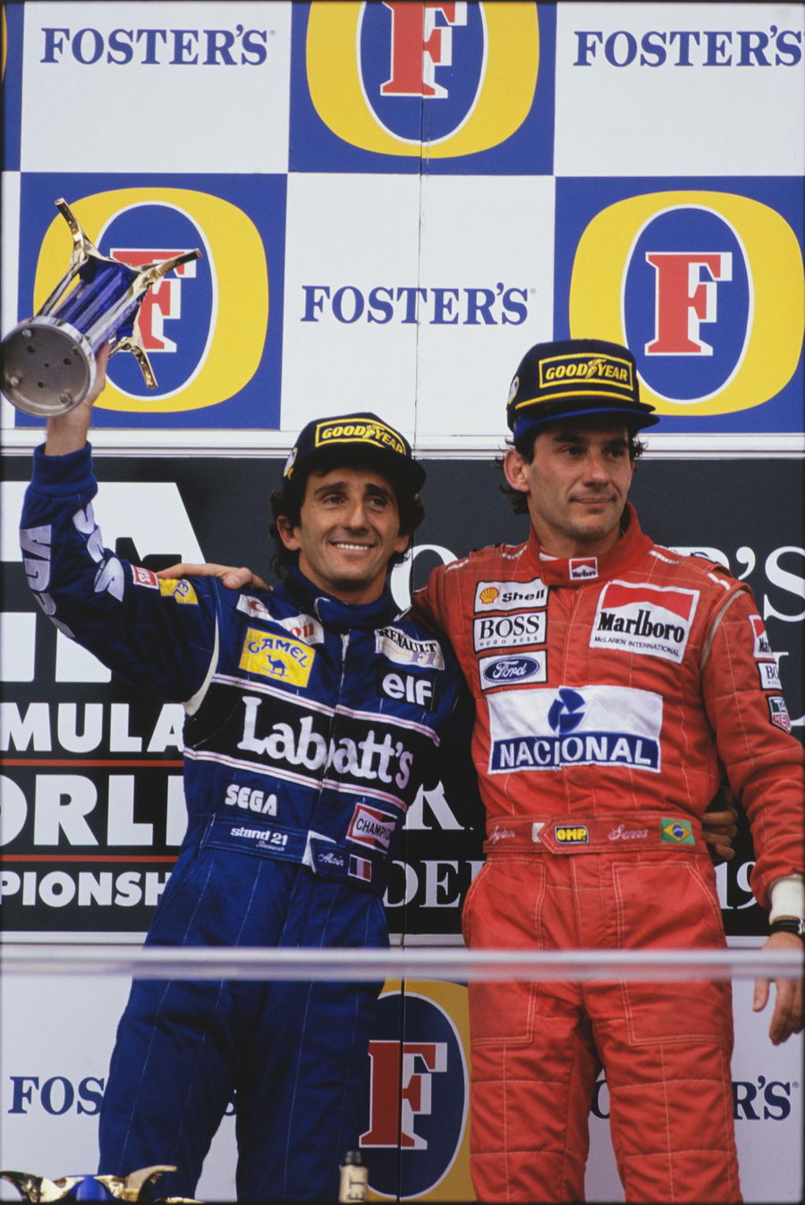 1993 Australian Grand Prix. Adelaide, Australia. 5 – 7 November 1993. Ayrton Senna (McLaren Ford) 1st position and Alain Prost (Williams Renault) 2nd position on the podium, portrait. PUBLICATIONxINxGERxSUIxAUTxHUNxONLY 93AUS02