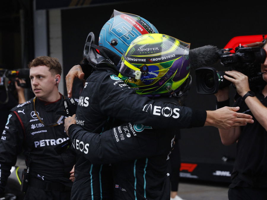 Formula One F1. Brazilian Grand Prix. Jose Carlos Pace Circuit. Sao Paulo. Brazil. November 13, 2022. Mercedes’ George Russell celebrates after winning the race with second place Mercedes’ Lewis Hamilton. REUTERS/Amanda Perobelli.