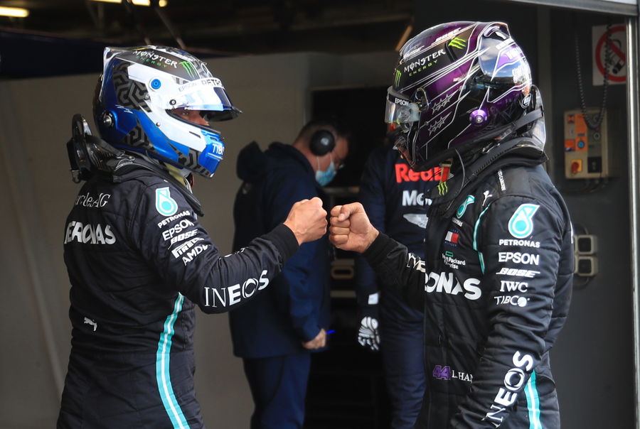 Formula One F1 – Eifel Grand Prix – Nurburgring, Nurburg, Germany – Mercedes’ Valtteri Bottas celebrates after qualifying pole position with Mercedes’ Lewis Hamilton who qualified second Pool via REUTERS/Wolfgang Rattay