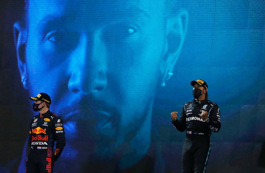 Formula One F1 – Bahrain Grand Prix – Bahrain International Circuit, Sakhir, Bahrain – March 28, 2021 Mercedes’ Lewis Hamilton celebrates winning the race on the podium with second placed Red Bull’s Max Verstappen REUTERS/Hamad I Mohammed