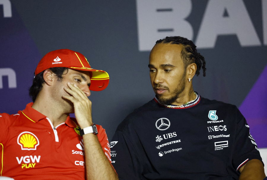 Formula One F1 – Bahrain Grand Prix – Bahrain International Circuit, Sakhir, Bahrain – February 28, 2024 Ferrari’s Carlos Sainz Jr. and Mercedes’ Lewis Hamilton during a press conference ahead of the Bahrain Grand Prix REUTERS/Rula Rouhana