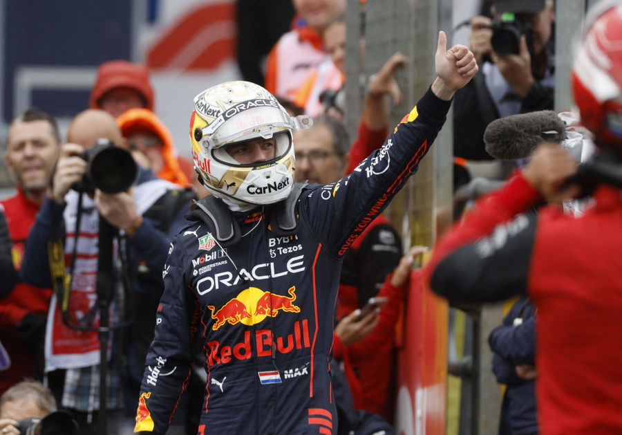 Formula One F1 – British Grand Prix – Silverstone Circuit, Silverstone, Britain – July 2, 2022, Red Bull’s Max Verstappen celebrates after qualifying in second place REUTERS/Peter Cziborra