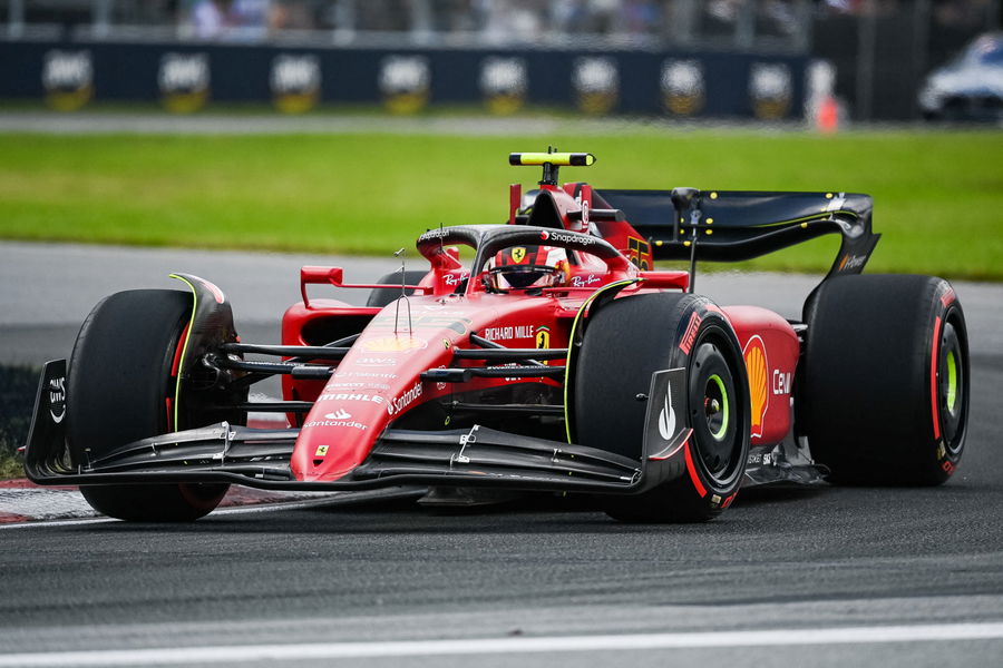Jun 17, 2022; Montreal, Quebec, CAN; Ferrari driver Carlos Sainz of Spain races in the Senna turns during the second free practice session at Circuit Gilles Villeneuve. Mandatory Credit: David Kirouac-USA TODAY Sports