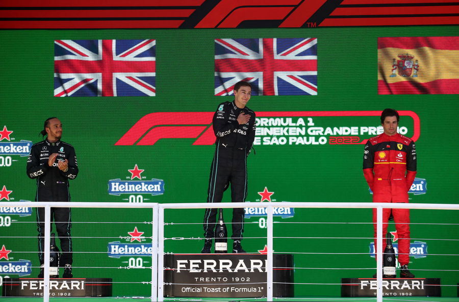 Formula One F1 – Brazilian Grand Prix – Jose Carlos Pace Circuit, Sao Paulo, Brazil – November 13, 2022 Mercedes’ George Russell celebrates on the podium after winning the race alongside second place Mercedes’ Lewis Hamilton and third place Ferrari’s Carlos Sainz Jr. REUTERS/Amanda Perobelli