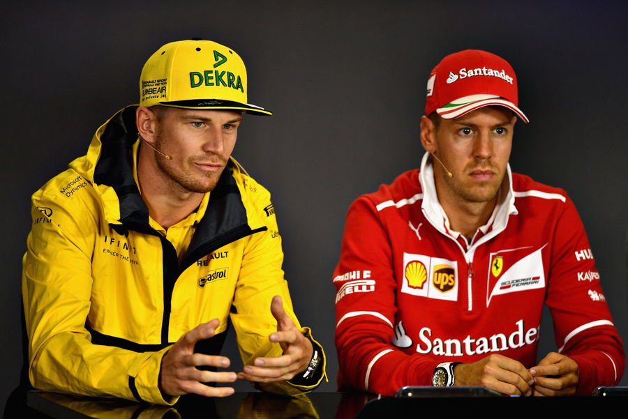 BUDAPEST, HUNGARY – JULY 27: Sebastian Vettel of Germany and Ferrari and Nico Hulkenberg of Germany and Renault Sport F1 in the Drivers Press Conference during previews ahead of the Formula One Grand Prix of Hungary at Hungaroring on July 27, 2017 in Budapest, Hungary. (Photo by Dan Mullan/Getty Images)