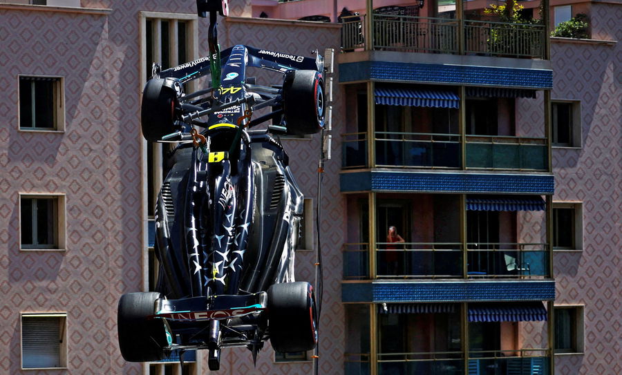 Formula One F1 – Formula One F1 – Monaco Grand Prix – Circuit de Monaco, Monte Carlo, Monaco – May 27, 2023. Marshals remove Mercedes’ Lewis Hamilton’s car from the race track with a crane after crashing during practice REUTERS/Stephane Mahe TPX IMAGES OF THE DAY