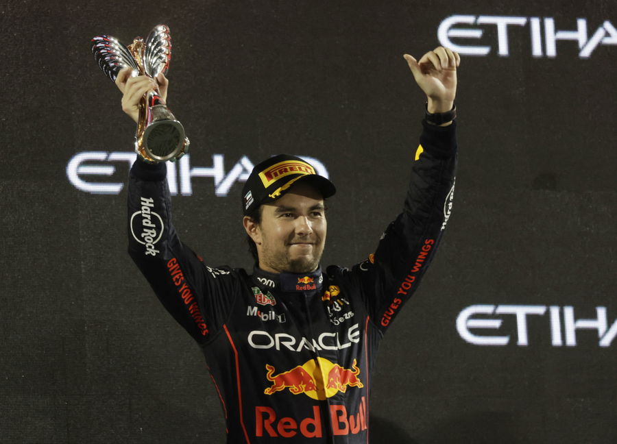 Formula One F1 – Abu Dhabi Grand Prix – Yas Marina Circuit, Abu Dhabi, United Arab Emirates – November 20, 2022 Red Bull’s Sergio Perez celebrates on the podium with a trophy after finishing in third place in the Abu Dhabi Grand Prix REUTERS/Leonhard Foeger