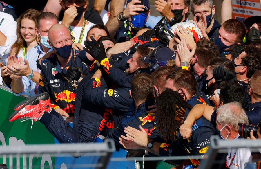 Formula One F1 – United States Grand Prix – Circuit of the Americas, Austin, Texas, U.S. – October 24, 2021 Red Bull’s Max Verstappen celebrates with teammates after winning the race REUTERS/Brian Snyder