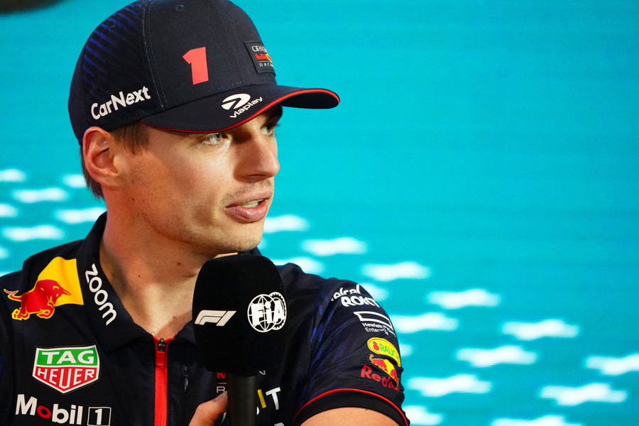 May 4, 2023; Miami Gardens, Florida, USA; Red Bull driver Max Verstappen (1) of the Netherlands talks with the media during a breakout media session at Miami International Autodrome. Mandatory Credit: John David Mercer-USA TODAY Sports