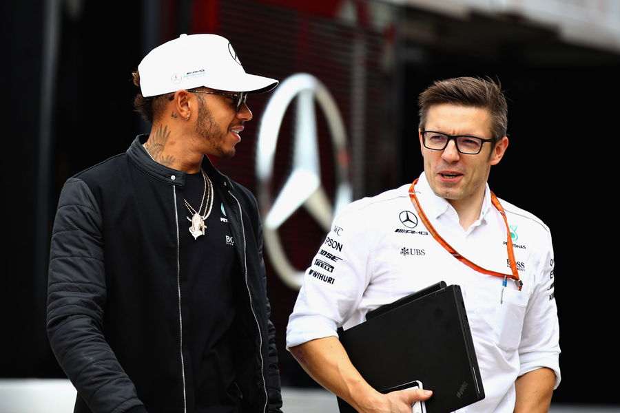 NORTHAMPTON, ENGLAND – JULY 13: Lewis Hamilton of Great Britain and Mercedes GP talks with race engineer Peter Bonnington in the Paddock during previews ahead of the Formula One Grand Prix of Great Britain at Silverstone on July 13, 2017 in Northampton, England. (Photo by Clive Mason/Getty Images)