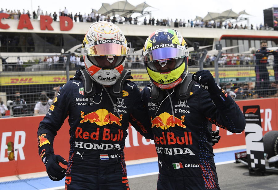 Formula One F1 – French Grand Prix – Circuit Paul Ricard, Le Castellet, France – June 20, 2021 Red Bull’s Max Verstappen celebrates after winning the race with third placed Red Bull’s Sergio Perez Pool via REUTERS/Nicolas Tucat
