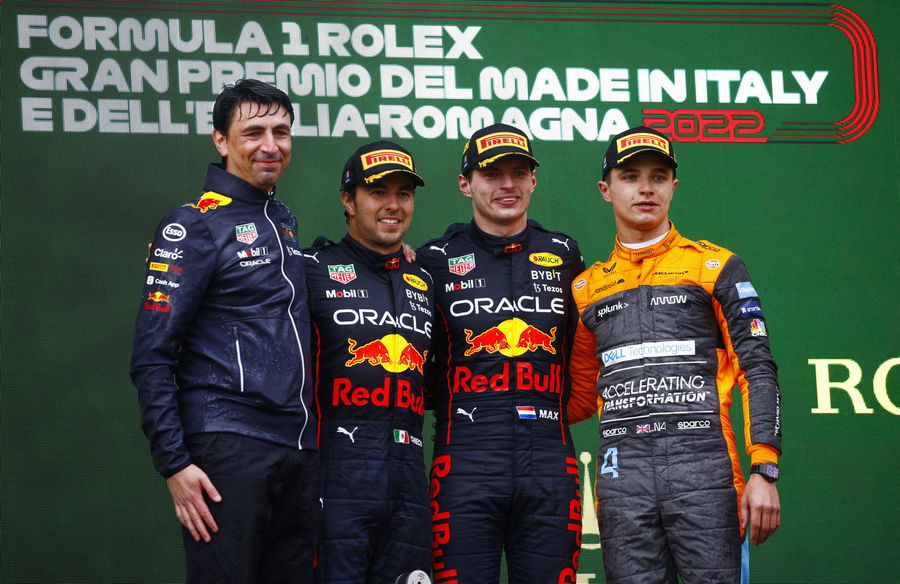 Formula One F1 – Emilia Romagna Grand Prix – Autodromo Enzo e Dino Ferrari, Imola, Italy – April 24, 2022 Red Bull’s Max Verstappen celebrates on the podium after winning the race alongside second place Red Bull’s Sergio Perez and third place McLaren’s Lando Norris REUTERS/Guglielmo Mangiapane