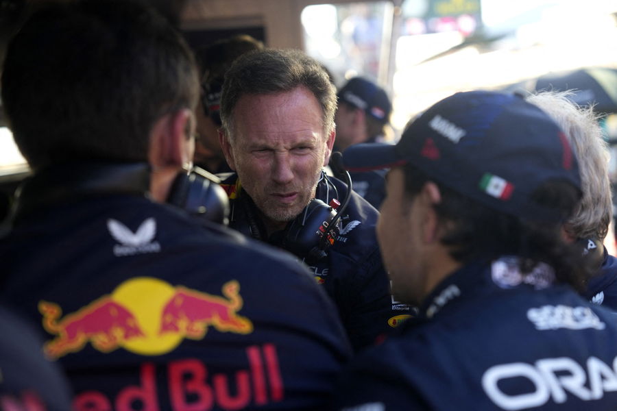 Formula One F1 – Australian Grand Prix – Melbourne Grand Prix Circuit, Melbourne, Australia – April 2, 2023 Red Bull team principal Christian Horner speaks to Sergio Perez during the third red flag Pool via REUTERS/Simon Baker