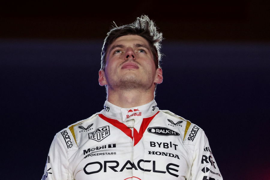 Formula One F1 – Las Vegas Grand Prix – Las Vegas Strip Circuit, Las Vegas, Nevada, U.S – November 18, 2023 First place Red Bull’s Max Verstappen celebrates on the podium REUTERS/Mike Blake