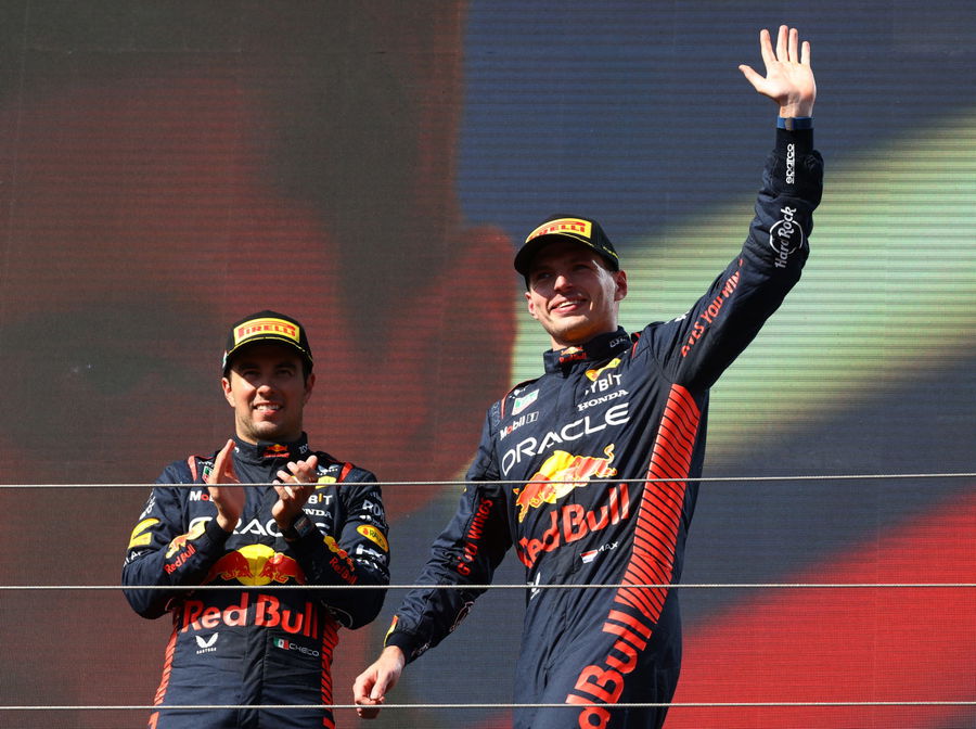 Formula One F1 – Hungarian Grand Prix – Hungaroring, Budapest, Hungary – July 23, 2023 Red Bull’s Max Verstappen celebrates on the podium after winning the Hungarian Grand Prix with third place Red Bull’s Sergio Perez REUTERS/Bernadett Szabo