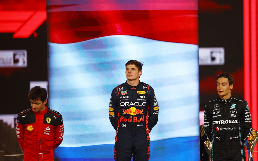 Formula One F1 – Abu Dhabi Grand Prix – Yas Marina Circuit, Abu Dhabi, United Arab Emirates – November 26, 2023 Red Bull’s Max Verstappen celebrates on the podium after winning the race along with second placed Ferrari’s Charles Leclerc and third placed Mercedes’ George Russell REUTERS/Rula Rouhana