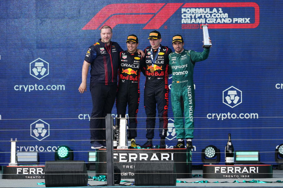 May 7, 2023; Miami Gardens, Florida, USA; Red Bull driver Max Verstappen (1) of the Netherlands, Red Bull driver Sergio Perez (11) of Mexico and Aston Martin driver Fernando Alonso (14) of Spain celebrate on the podium after their finishes in the Miami Grand Prix at Miami International Autodrome. Mandatory Credit: Jasen Vinlove-USA TODAY Sports