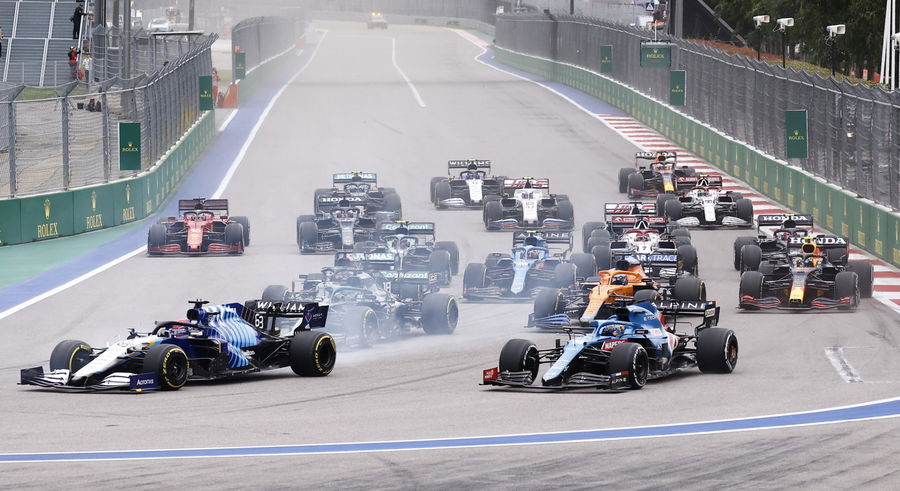 Formula One F1 – Russian Grand Prix – Sochi Autodrom, Sochi, Russia – September 26, 2021 Williams’ George Russell in action on first corner at the start of the race REUTERS/Maxim Shemetov