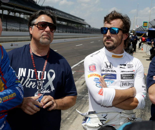 Car owner Michael Andretti, left, talks with driver Fernando Alonso, of Spain, during a practice session for the Indianapolis 500 IndyCar auto race at Indianapolis Motor Speedway, Thursday, May 18, 2017, in Indianapolis. (AP Photo/Michael Conroy) ORG XMIT: NAA115