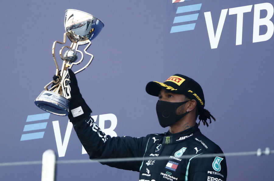 Formula One F1 – Russian Grand Prix – Sochi Autodrom, Sochi, Russia – Mercedes’ Lewis Hamilton celebrates with the trophy on the podium after finishing in third place in the race. Pool via REUTERS/Maxim Shemetov
