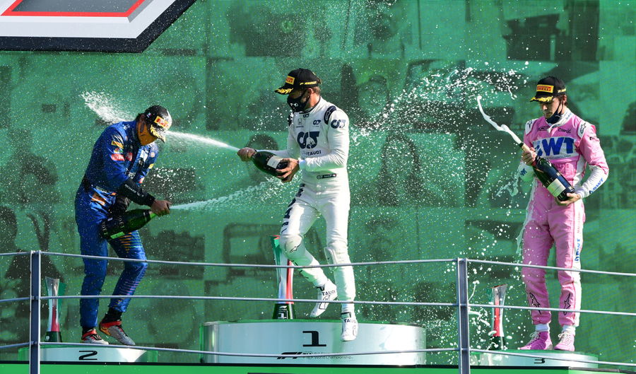 Formula One F1 – Italian Grand Prix – Autodromo Nazionale Monza, Monza, Italy – September 6, 2020 AlphaTauri’s Pierre Gasly sprays champagne as he celebrates winning the Italian Grand Prix on the podium with second placed McLaren’s Carlos Sainz Jr. and third placed Racing Point’s Lance Stroll REUTERS/Jennifer Lorenzini/Pool