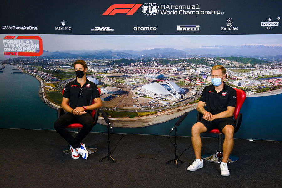 Formula One F1 – Russian Grand Prix – Sochi Autodrom, Sochi, Russia – Incumbent Haas drivers Romain Grosjean and Kevin Magnussen during the press conference FIA/Handout via REUTERS