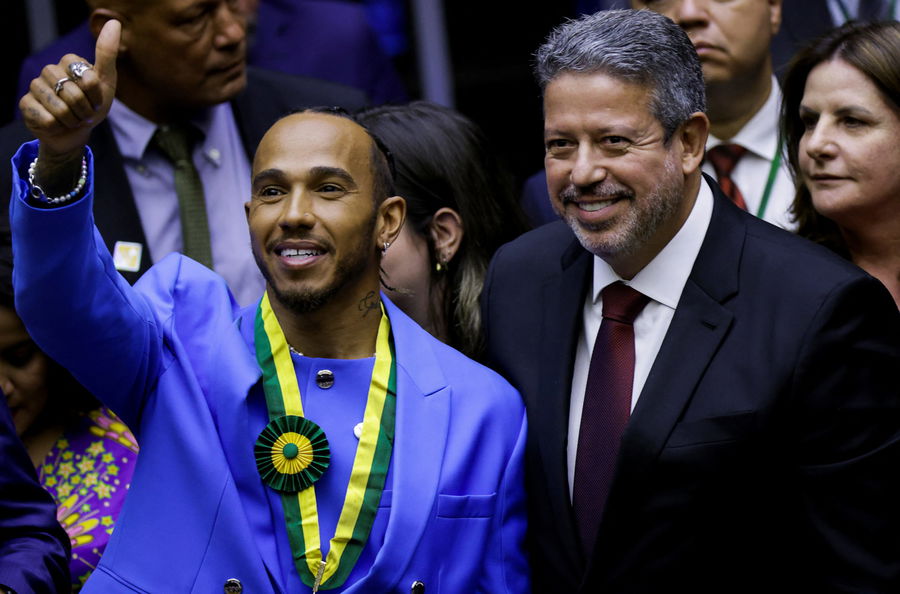 British Formula One racing driver, Lewis Hamilton gestures next to President of the Chamber Arthur Lira. After he received the title of honorary citizen of Brazil at the Chamber of Deputies in Brasilia. Brazil November 7, 2022. REUTERS/Adriano Machado