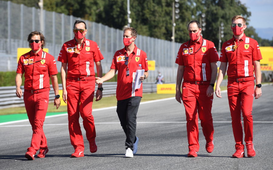 Formula One F1 – Italian Grand Prix – Autodromo Nazionale Monza, Monza, Italy – September 3, 2020 Ferrari’s Sebastian Vettel walks around the track with teammates ahead of the Italian grand prix REUTERS/Jennifer Lorenzini