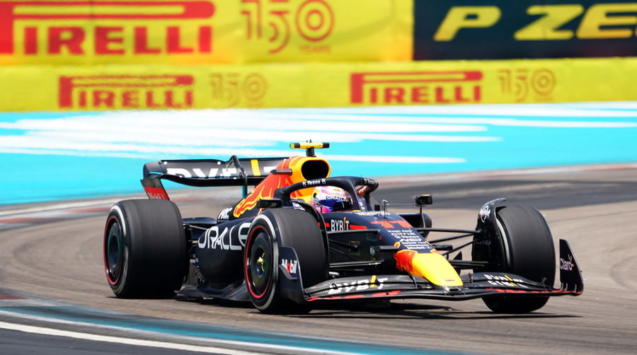 May 6, 2022; Miami Gardens, Florida, USA; Red Bull driver Sergio Perez of Mexico races into turn 8 the MIA Marina through the circuit during the third practice session for the Miami Grand Prix at Miami International Autodrome. Mandatory Credit: John David Mercer-USA TODAY Sports