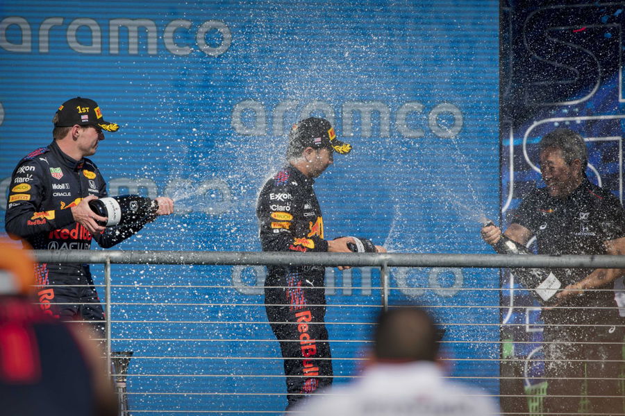Oct 24, 2021; Austin, TX, USA; Red Bull Racing Honda driver Max Verstappen (33) of Team Netherlands (left) and Red Bull Racing Honda driver Sergio Perez (11) of Team Mexico (center) and Honda Chief Executive Masashi Yamamoto (right) celebrate on the podium after the running of the United States Grand Prix Race at Circuit of the Americas. Mandatory Credit: Jerome Miron-USA TODAY Sports
