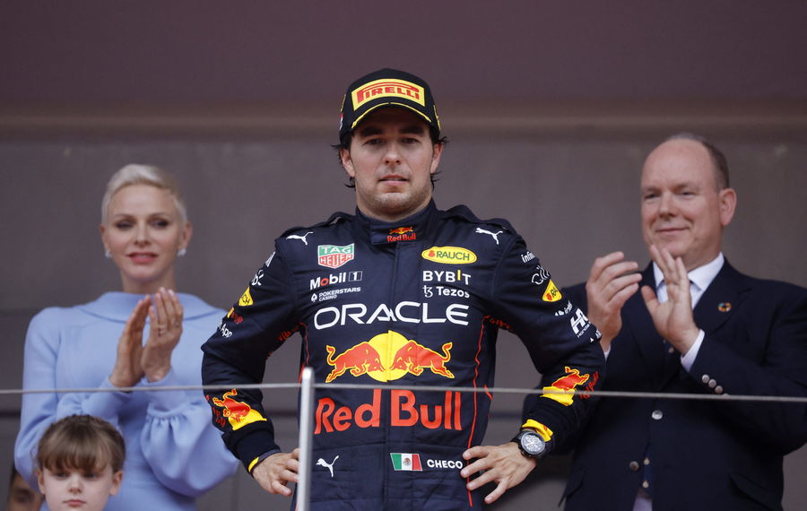 Formula One F1 – Monaco Grand Prix – Circuit de Monaco, Monte Carlo, Monaco – May 29, 2022 Red Bull’s Sergio Perez celebrates on the podium after winning the race as Prince Albert II of Monaco and Princess Charlene of Monaco applaud REUTERS/Christian Hartmann