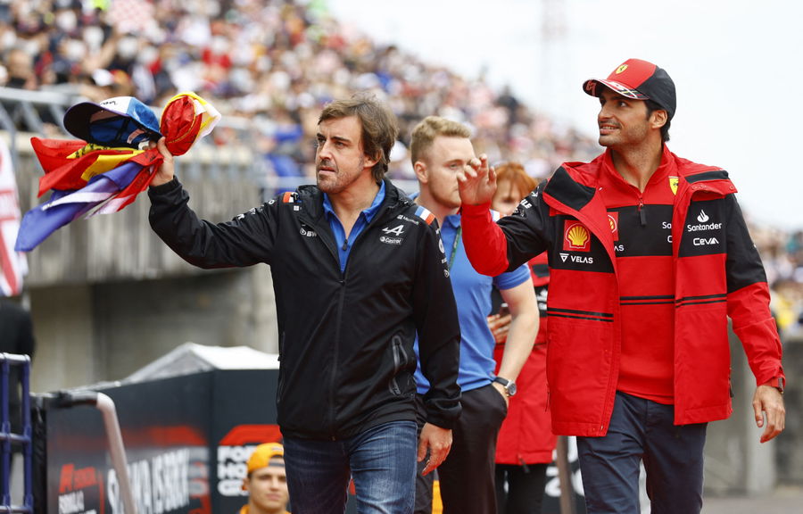 Formula One F1 – Japanese Grand Prix – Suzuka Circuit, Suzuka, Japan – October 9, 2022 Alpine’s Fernando Alonso and Ferrari’s Carlos Sainz Jr. wave ahead of the race REUTERS/Kim Kyung-Hoon
