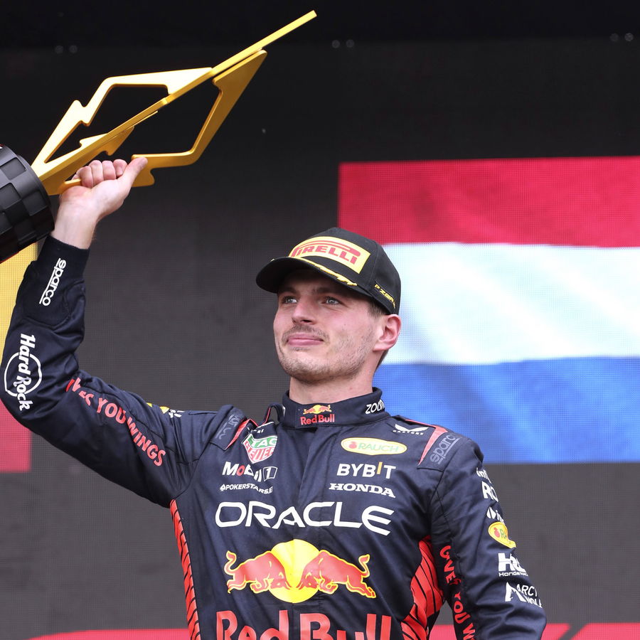 Formula 1 2023: Miami GP MIAMI INTERNATIONAL AUTODROME, UNITED STATES OF AMERICA – MAY 07: Sergio Perez, Red Bull Racing, 2nd position, and Max Verstappen, Red Bull Racing, 1st position, on the podium during the Miami GP at Miami International Autodrome on Sunday May 07, 2023 in Miami, United States of America. (Photo by Alexander Trienitz / Motorsport.com)