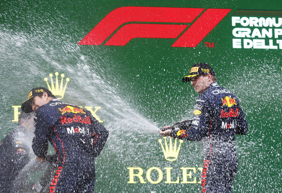 Formula One F1 – Emilia Romagna Grand Prix – Autodromo Enzo e Dino Ferrari, Imola, Italy – April 24, 2022 Red Bull’s Max Verstappen celebrates on the podium after winning the race alongside second place Red Bull’s Sergio Perez REUTERS/Guglielmo Mangiapane