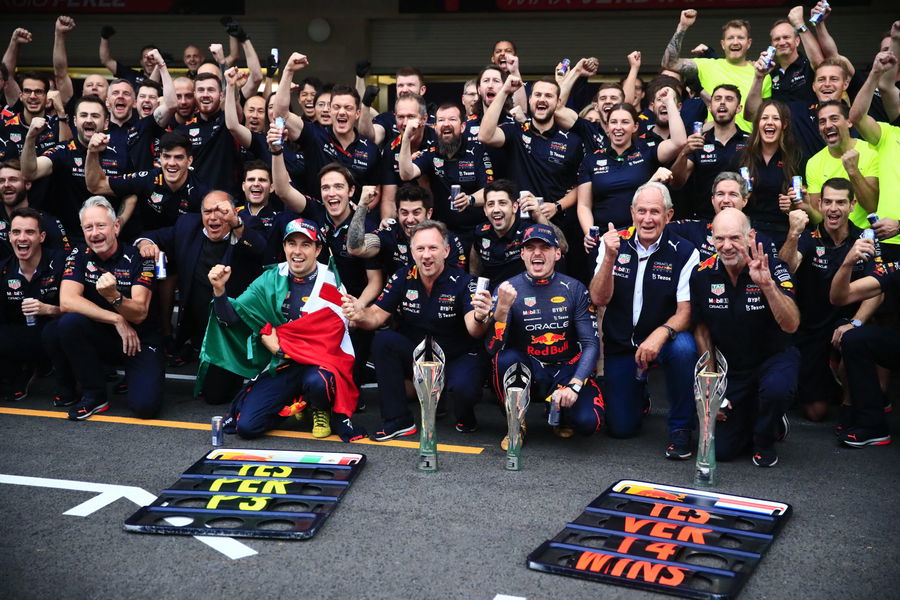 Formula One F1 – Mexico City Grand Prix – Autodromo Hermanos Rodriguez, Mexico City, Mexico – October 30, 2022 Red Bull’s Sergio Perez , Max Verstappen, team principal Christian Horner and the rest of the team celebrate after the race REUTERS/Carlos Perez Gallardo