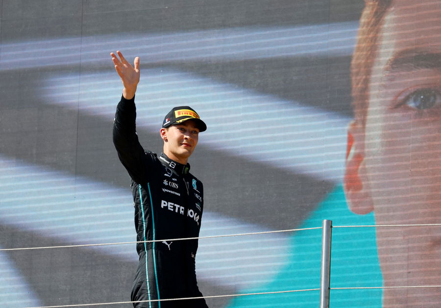 Formula One F1 – French Grand Prix – Circuit Paul Ricard, Le Castellet, France – July 24, 2022 Mercedes’ George Russell celebrates on the podium after finishing third in the race REUTERS/Eric Gaillard