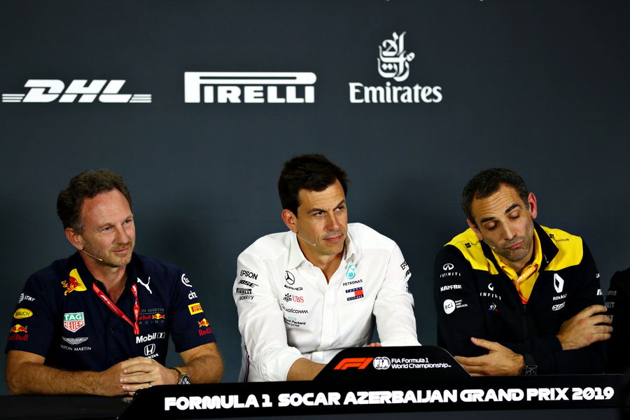 BAKU, AZERBAIJAN – APRIL 26: The Team Principals Press Conference with Red Bull Racing Team Principal Christian Horner, Mercedes GP Executive Director Toto Wolff, and Renault Sport F1 Managing Director Cyril Abiteboul during practice for the F1 Grand Prix of Azerbaijan at Baku City Circuit in Baku, Azerbaijan. (Photo by Dan Istitene/Getty Images)