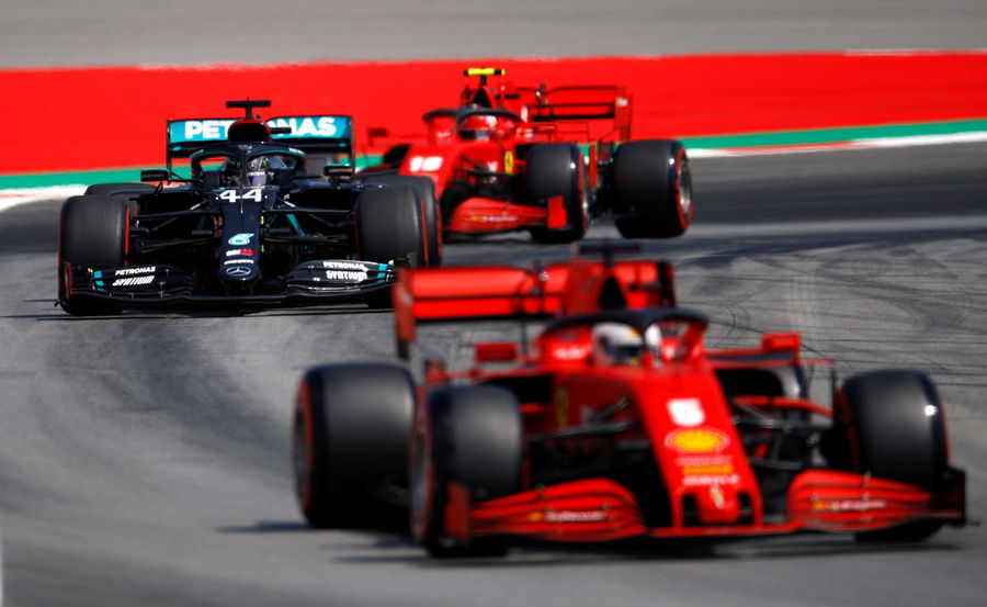 Formula One F1 – Spanish Grand Prix – Circuit de Barcelona-Catalunya, Barcelona, Spain – August 15, 2020, Mercedes’ Lewis Hamilton, Ferrari’s Sebastian Vettel, and Ferrari’s Charles Leclerc in action during qualifying